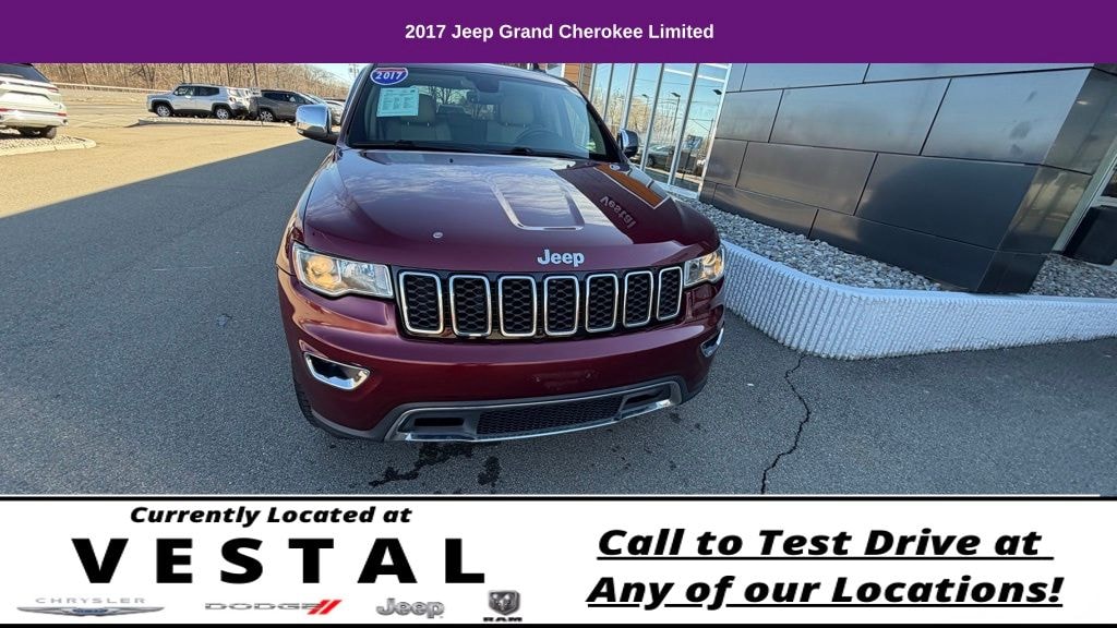 4WD, 1-Year SiriusXM Radio Service, 3.45 Rear Axle Ratio, 4-Wheel Disc Brakes, 6 Month Trial (Registration Required), 6 Speakers, 8.4" Touchscreen Display, ABS brakes, Air Conditioning, Alloy wheels, AM/FM radio: SiriusXM, Anti-whiplash front head restraints, Audio memory, Auto-dimming door mirrors, Auto-Dimming Exterior Passenger Mirror, Auto-dimming Rear-View mirror, Automatic temperature control, Blind Spot & Cross Path Detection, Brake assist, Bumpers: body-color, Compass, Delay-off headlights, Driver door bin, Driver vanity mirror, Dual front impact airbags, Dual front side impact airbags, Electronic Stability Control, Engine Oil Cooler, For Details Visit DriveUconnect.com, For More Info, Call 800-643-2112, Four wheel independent suspension, Front anti-roll bar, Front Bucket Seats, Front Center Armrest w/Storage, Front dual zone A/C, Front fog lights, Front reading lights, Fully automatic headlights, Garage door transmitter, GPS Antenna Input, Heated door mirrors, Heated front seats, Heated rear seats, Heated steering wheel, Illuminated entry, Instrument Cluster w/Off-Road Disp. Pages, Integrated Voice Command w/Bluetooth, Knee airbag, Leather Shift Knob, Leather Trimmed Bucket Seats, Low tire pressure warning, Memory seat, Nav-Capable! See Dealer for Details, Normal Duty Suspension, Occupant sensing airbag, Outside temperature display, Overhead airbag, Overhead console, Panic alarm, ParkView Rear Back-Up Camera, Passenger door bin, Passenger vanity mirror, Power door mirrors, Power driver seat, Power Liftgate, Power passenger seat, Power steering, Power Sunroof, Power windows, Quick Order Package 23H, Radio data system, Radio: Uconnect 3 w/5" Display, Radio: Uconnect 3C w/8.4" Display, Rear anti-roll bar, Rear reading lights, Rear seat center armrest, Rear window defroster, Rear window wiper, Remote keyless entry, Roadside Assistance & 9-1-1 Call, Roof rack: rails only, Security system, SiriusXM Satellite Radio, Speed control, Speed-Sensitive Wipers, Split folding rear seat, Spoiler, Steering wheel mounted audio controls, Tachometer, Telescoping steering wheel, Tilt steering wheel, Traction control, Trip computer, Turn signal indicator mirrors, Uconnect Access, Variably intermittent wipers, Wheels: 18" x 8.0" Tech Gray Aluminum, 4WD. Odometer is 7289 miles below market average! 2017 Jeep Grand Cherokee 4D Sport Utility Limited Velvet Red Pearlcoat 4WD 8-Speed Automatic 3.6L V6 24V VVT