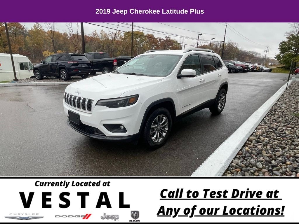 3.734 Axle Ratio, 4-Wheel Disc Brakes, 6 Speakers, ABS brakes, Air Conditioning, All-Season Floor Mats, Alloy wheels, AM/FM radio: SiriusXM, Anti-whiplash front head restraints, Apple CarPlay/Android Auto, AutoStick Automatic Transmission, Auxiliary Transmission Oil Cooler, Bluetooth, Brake assist, Bumpers: body-color, Cloth/Premium Vinyl Bucket Seats, Cold Weather Group, Compass, Delay-off headlights, Driver door bin, Driver vanity mirror, Dual front impact airbags, Dual front side impact airbags, Electronic Stability Control, Engine Block Heater, Four wheel independent suspension, Front anti-roll bar, Front Bucket Seats, Front Center Armrest, Front fog lights, Front reading lights, Fully automatic headlights, Heated door mirrors, Heated Front Seats, Heated Steering Wheel, Illuminated entry, Integrated Voice Command w/Bluetooth, Knee airbag, Latitude Plus Badge (DISC), Leather Shift Knob, Low tire pressure warning, Normal Duty Suspension, Occupant sensing airbag, Outside temperature display, Overhead airbag, Overhead console, Panic alarm, ParkView Rear Back-Up Camera, Passenger door bin, Passenger vanity mirror, Power door mirrors, Power driver seat, Power steering, Power windows, Quick Order Package 2BD, Radio data system, Radio: Uconnect 4 w/7" Display, Rear anti-roll bar, Rear reading lights, Rear seat center armrest, Rear side impact airbag, Rear window defroster, Rear window wiper, Remote keyless entry, Remote Start System, Roof rack: rails only, SiriusXM Satellite Radio, Speed control, Speed-sensing steering, Split folding rear seat, Spoiler, Steering wheel mounted audio controls, Stop-Start Multiple VSM System, Tachometer, Telescoping steering wheel, Tilt steering wheel, Traction control, Trip computer, Turn signal indicator mirrors, USB Host Flip, Variably intermittent wipers, Wheels: 17" x 7" Satin Carbon Aluminum, Windshield Wiper De-Icer. 2019 Jeep Cherokee 4D Sport Utility Latitude Plus Bright White Clearcoat 4WD 9-Speed 948TE Automatic 2.4L I4