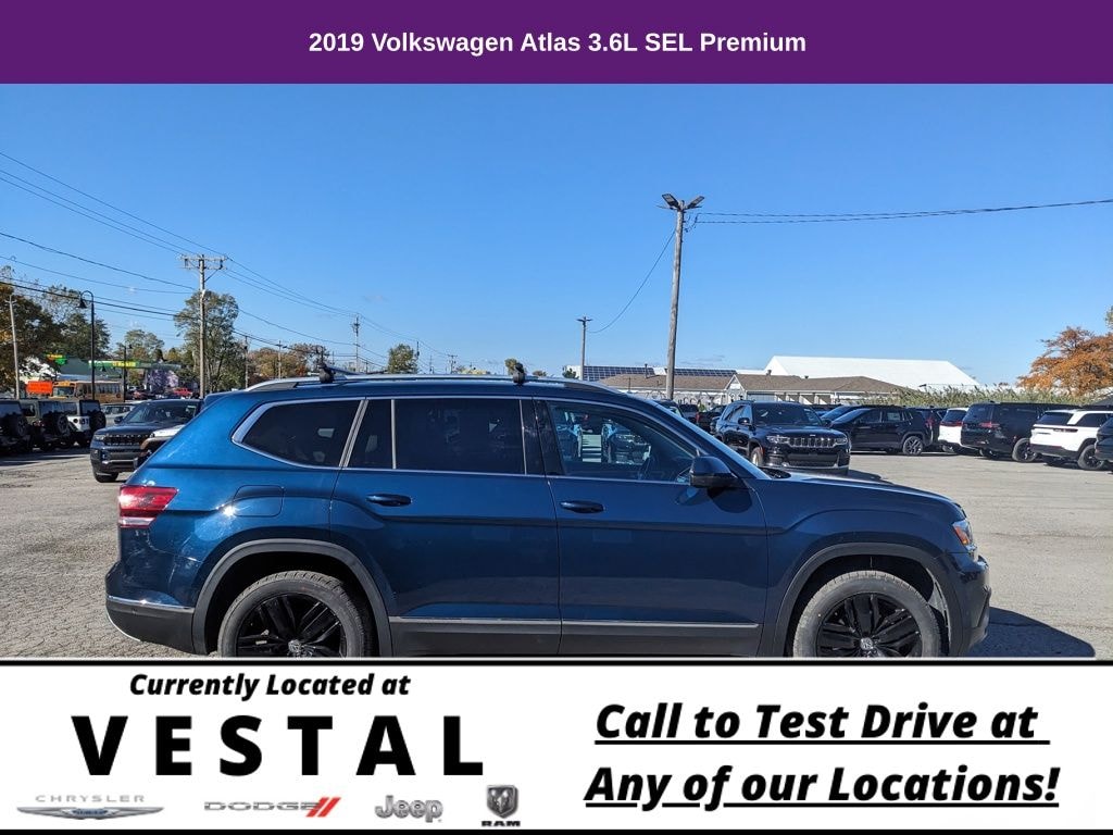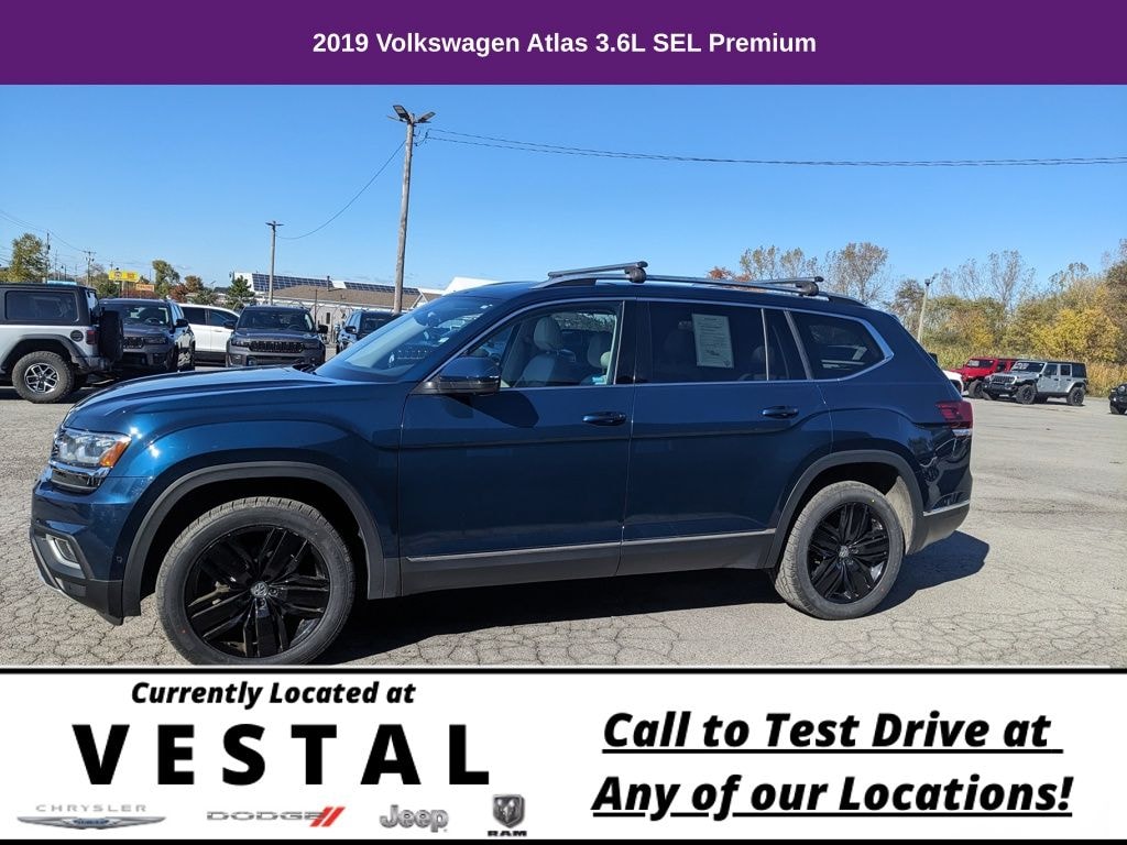 12 Speakers, 3.60 Axle Ratio, 3rd row seats: split-bench, 4-Wheel Disc Brakes, ABS brakes, Active Blind Spot Monitor, Air Conditioning, Alloy wheels, AM/FM radio: SiriusXM, Auto High-beam Headlights, Auto-dimming Rear-View mirror, Automatic temperature control, Brake assist, Bumpers: body-color, Compass, Delay-off headlights, Driver door bin, Driver vanity mirror, Dual front impact airbags, Dual front side impact airbags, Electronic Stability Control, Emergency communication system: VW Car-Net services (capabilities require enrollment or subscription), Forward collision: FCW w/Autonomous Emergency Braking mitigation, Four wheel independent suspension, Front anti-roll bar, Front Bucket Seats, Front Center Armrest, Front dual zone A/C, Front fog lights, Front reading lights, Garage door transmitter: HomeLink, Heated door mirrors, Heated front seats, Heated rear seats, Heated steering wheel, Htd/Actively Ventilated Comfort Front Bucket Seats, Illuminated entry, Low tire pressure warning, Memory seat, Navigation System, Occupant sensing airbag, Outside temperature display, Overhead airbag, Overhead console, Panic alarm, Passenger door bin, Passenger vanity mirror, Perforated Vienna Leather Seating Surfaces, Power door mirrors, Power driver seat, Power Liftgate, Power moonroof, Power passenger seat, Power steering, Power windows, Radio data system, Radio: Discover Media 8.0" Touchscreen w/Nav, Rain sensing wipers, Rear air conditioning, Rear anti-roll bar, Rear audio controls, Rear reading lights, Rear seat center armrest, Rear window defroster, Rear window wiper, Remote CD player, Remote keyless entry, Roof rack: rails only, Security system, Speed control, Speed-sensing steering, Split folding rear seat, Spoiler, Standard Suspension, Steering wheel mounted audio controls, Tachometer, Telescoping steering wheel, Tilt steering wheel, Traction control, Trip computer, Turn signal indicator mirrors, Variably intermittent wipers, Ventilated front seats, Wheels: 20" Silver Triple 5-Spoke Alloy. 2019 Volkswagen Atlas 4D Sport Utility SEL Premium 4Motion AWD 8-Speed Automatic with Tiptronic 3.6L V6